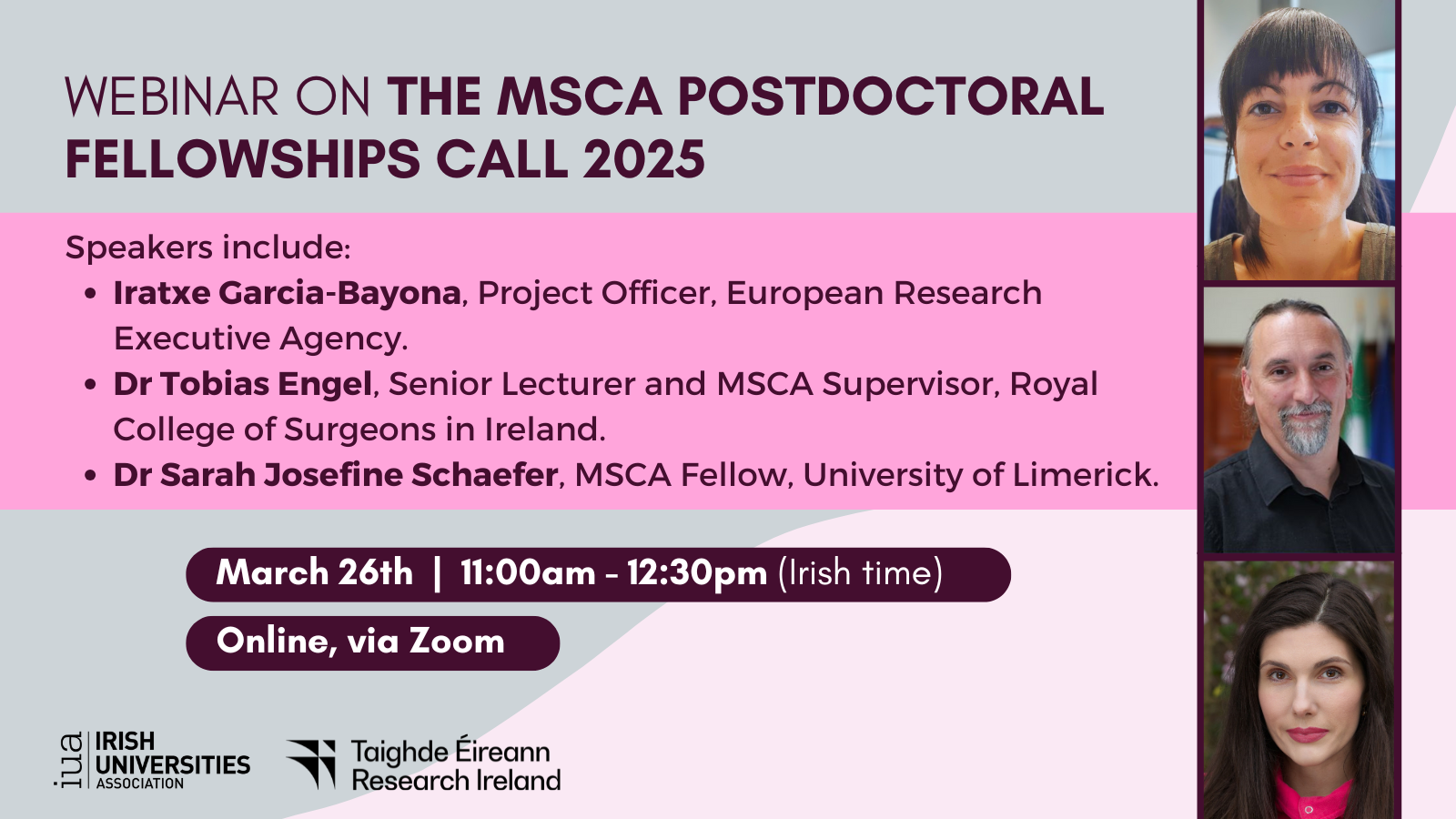 Dr Sarah Josefine Schaefer was invited speaker at this year’s MSCA webinar of the Irish Universities Association. The webinar provides information on the 2025 MSCA call and gives insights into the application process and the MSCA experience from past successful applicants and supervisors. The Irish Universities Association provides access to both the speakers’ presentations and the recording of the webinar.